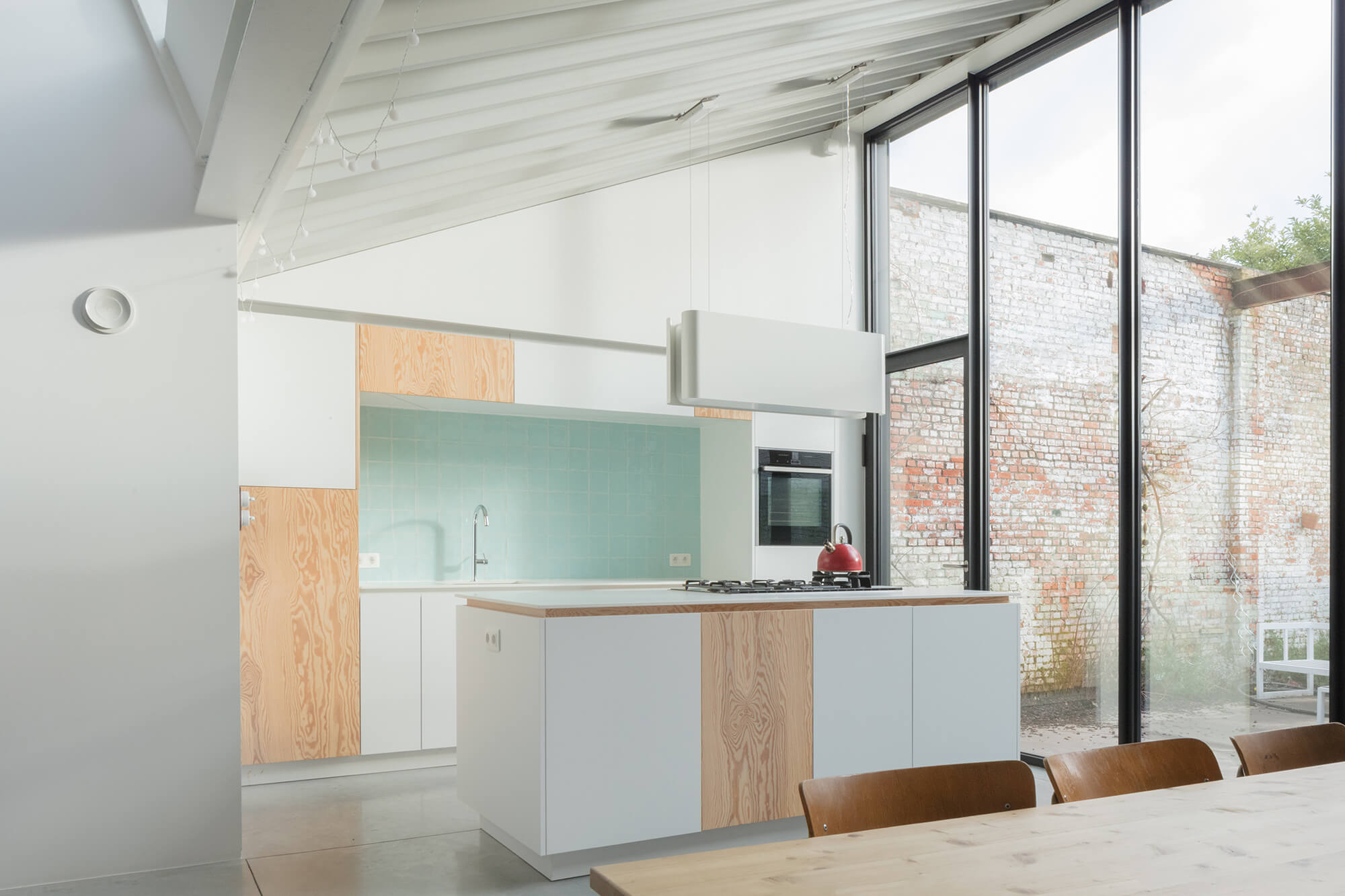 The kitchen he created in collaboration with Maku Interieur for Eline and Jan in Sint-Niklaas has an industrial style. The rough look of the new extension relates to the history of the premises. Construction elements are notably present in this former car paint factory. The brick walls and steel girders refer to the industrial history of the building along with the new shed roofs, which can usually be seen in factory halls. The new kitchen design is based upon this old story, with an industrial look that also includes domestic elements. The kitchen was executed in white laminate, plywood Polish pine and with a green tile splashback.