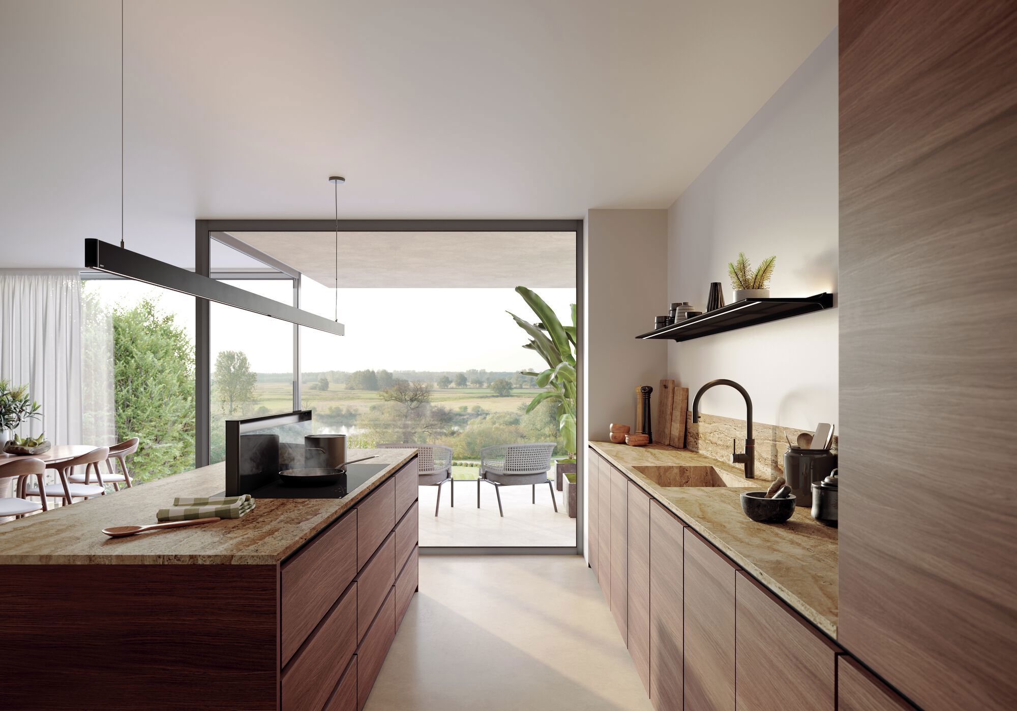Both worktop extraction and extractor hoods can be equipped with external venting or recirculation. More and more people nowadays opt for recirculation. This energy-efficient solution is recommended for everyone who has a ventilation system at home and where external venting would disrupt the system's balance. With recirculation, cooking fumes are cleaned and recovered indoors. With extractor hoods, a recirculation box is integrated into the (false) ceiling or niche, while with worktop extraction it's integrated into the plinth. If you choose extraction to the outside, keep in mind the piping. The shorter the pipe, the smoother the venting. For hobs with extraction, external venting is rarely chosen, especially with a cooking island. Recirculation is much easier to integrate into an island setup.