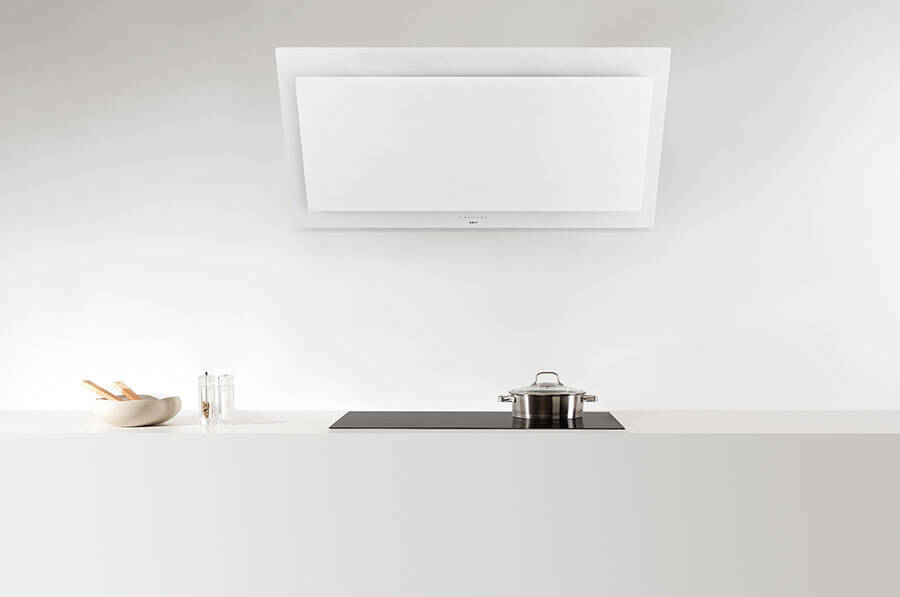 A wall-mounted cooker hood can be placed on the wall in a variety of ways. By itself in the middle of the wall, in a corner, or discreetly between the kitchen cabinets? If you choose a version with recirculation, you can place the wall-mounted hood wherever you want. With traditional exhaust to the outside, of course, you have to consider the location of the outlet.