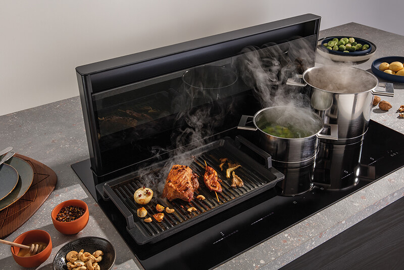 - Da das Absaugsystem in das Kochfeld integriert ist, lässt sich viel Platz sparen. Dadurch gibt es mehr Stauraum und Bewegungsfreiheit in der Küche.