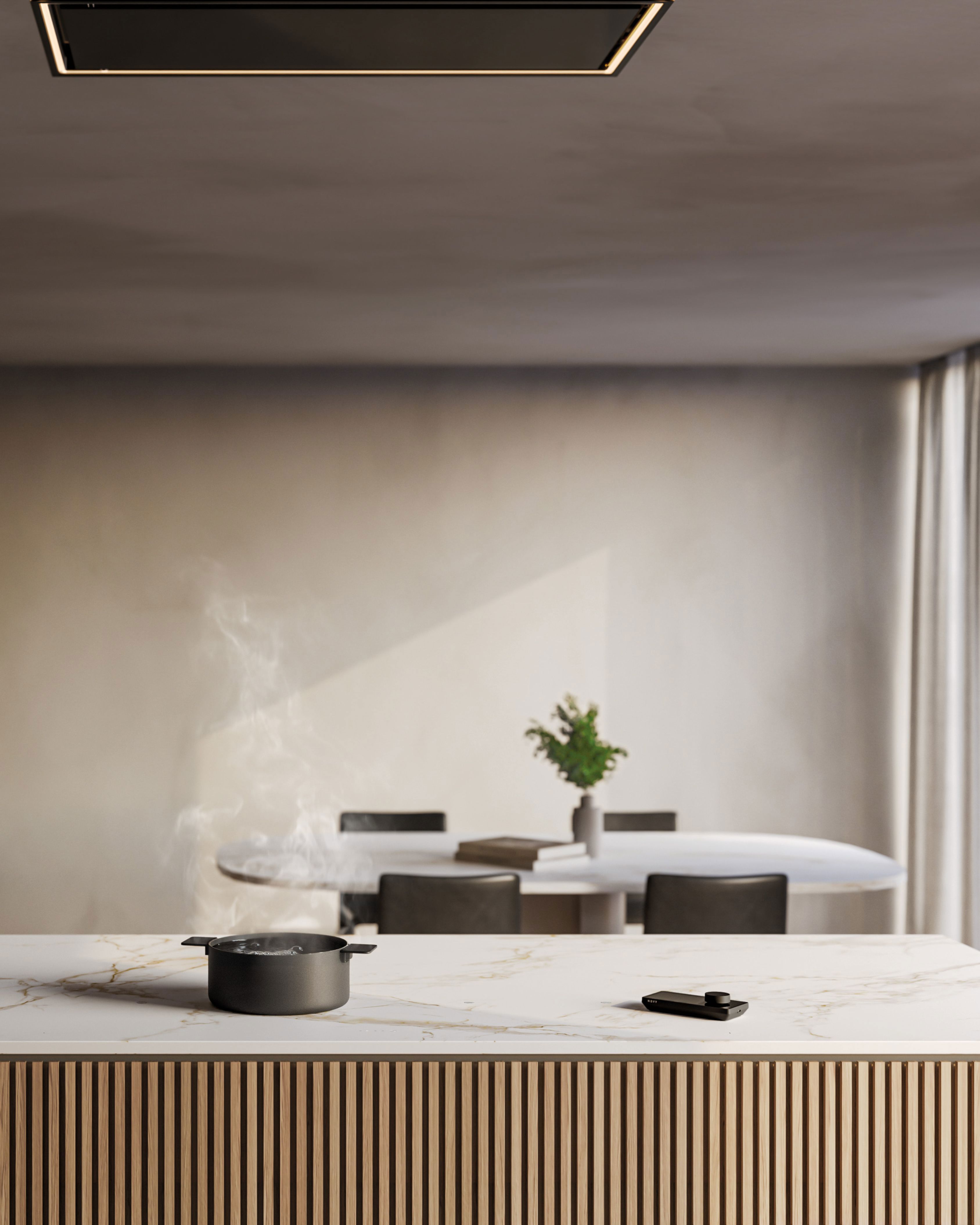 Auch die Novy Pureline setzt auf zurückhaltende Eleganz: Flächenbündig in die Decke integriert, sorgt sie flüsterleise für Frischluft, ohne die Raumwerkung zu stören. Gemeinsam sind Novy Undercover und Novy Pureline ein starkes Duo: unauffällig halten sie die Blickachsen frei, sorgen für optische Ruhe und überzeugen auf den Punkt mit Effizienz und Leistung, wenn gekocht wird.