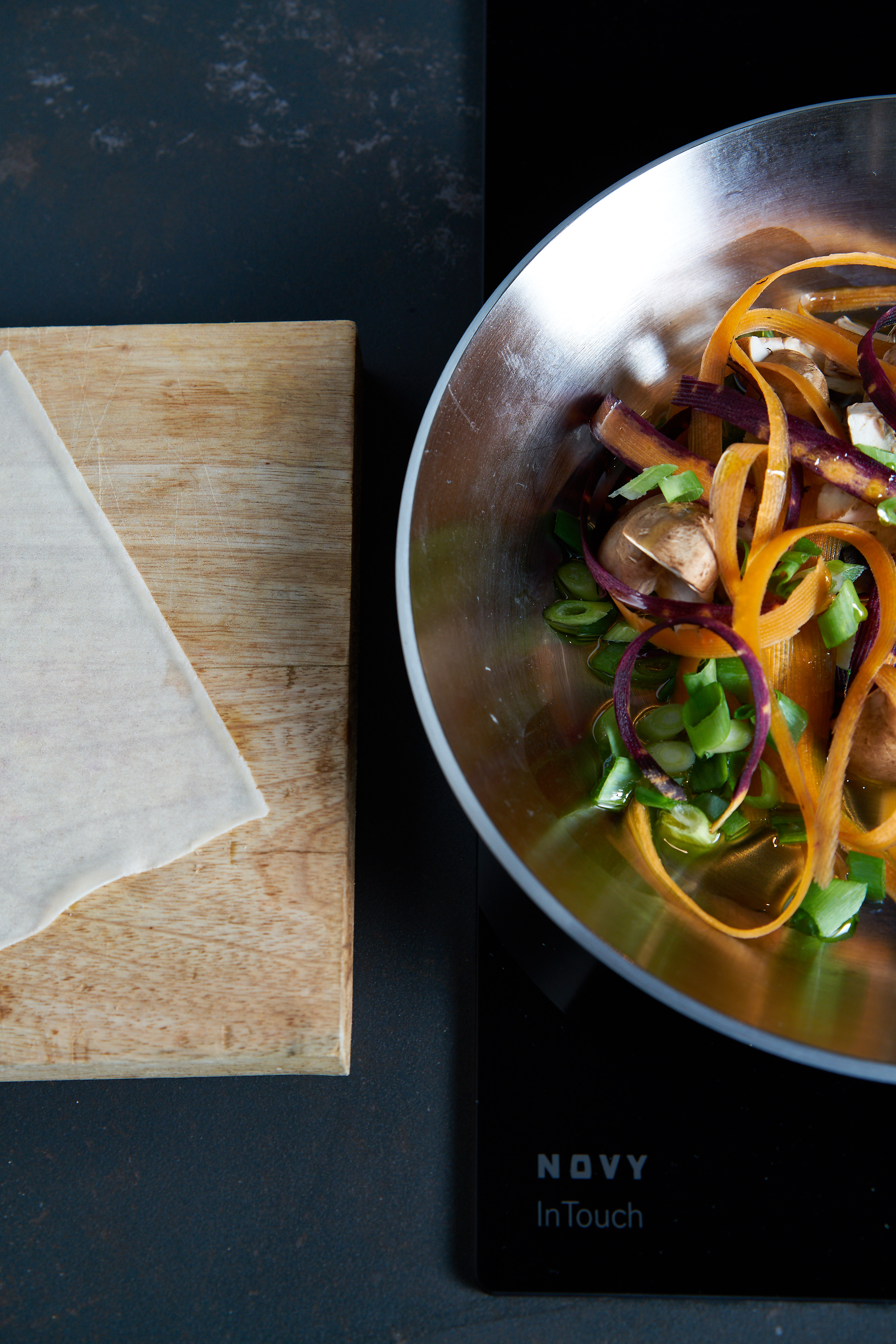 - Allow the spring roll sheets to thaw and drape them in the shape of a diamond. The accompanying video shows you how. Fill them with a spoonful of stir-fried vegetables and roll them up. Put some water on the edges to seal them.