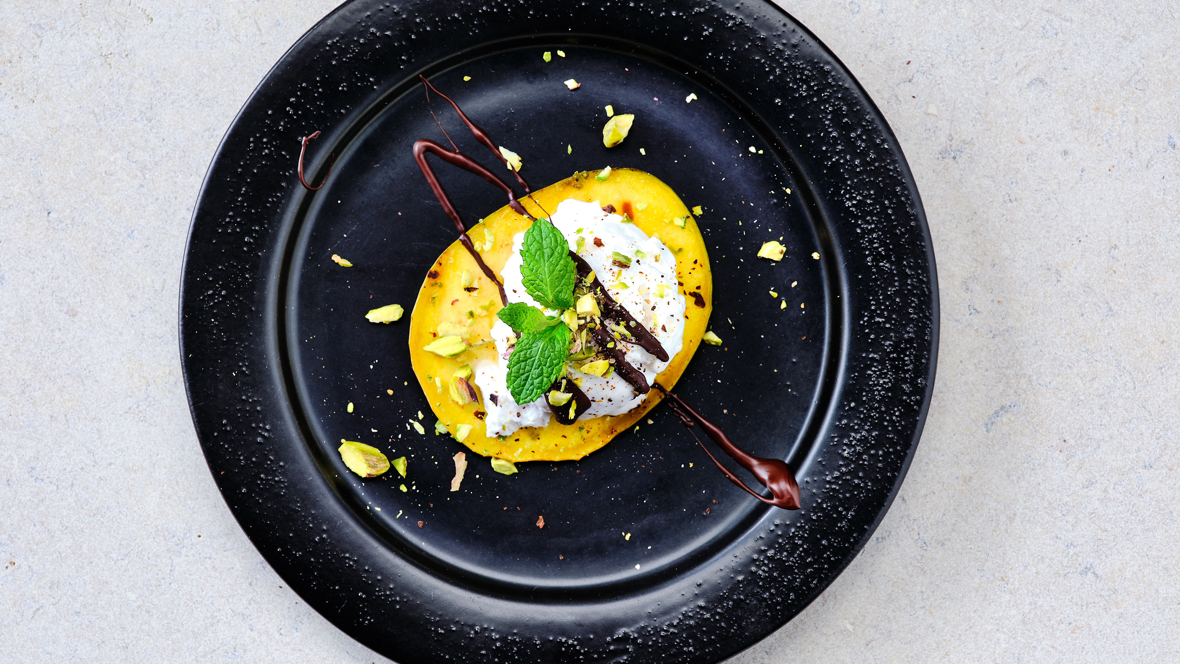 - Serve the mango with coconut ice cream, lime zest, the chopped pistachio nuts and the lukewarm chocolate sauce.