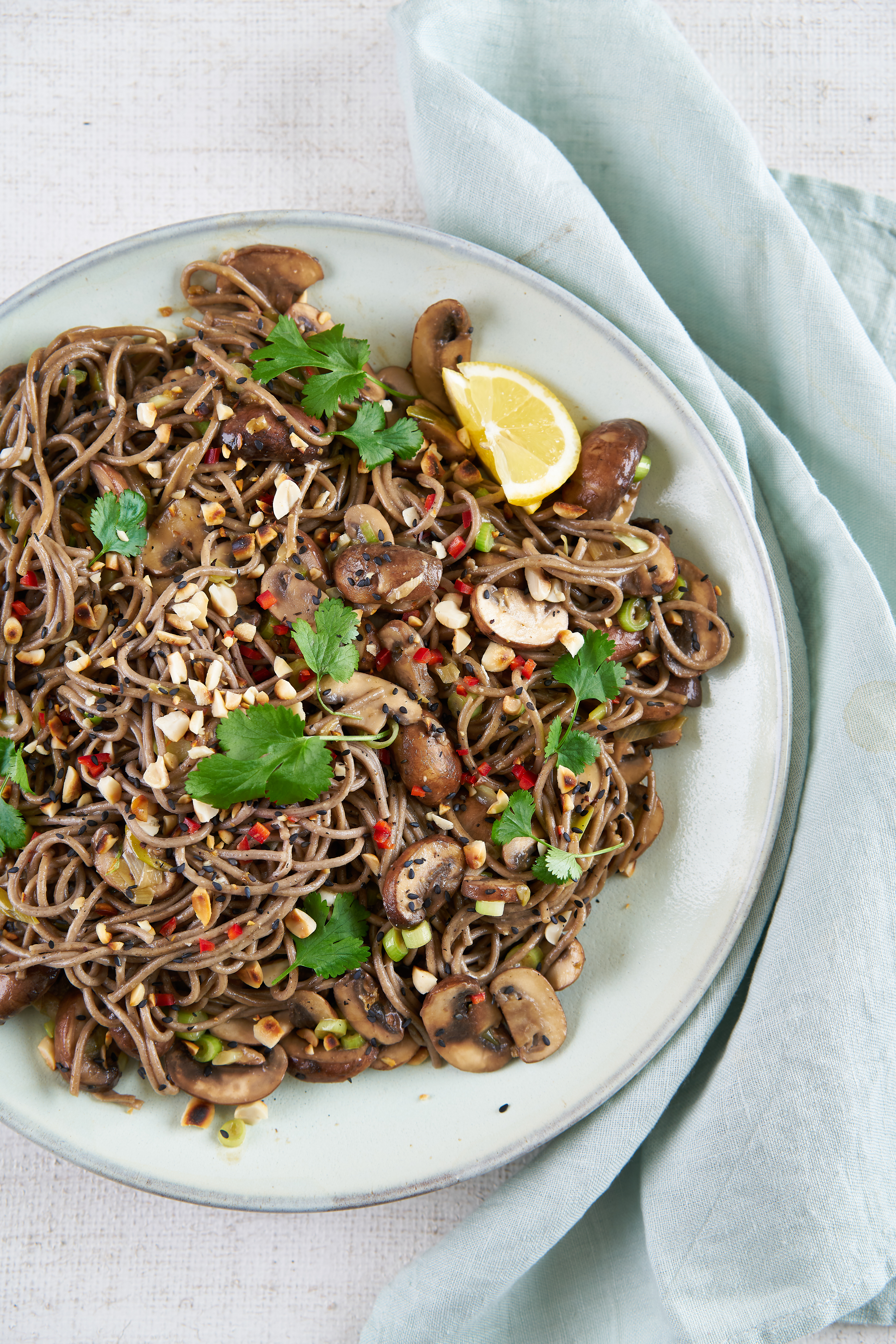 Add the soba noodles to the shiitake and stir together well. Sprinkle with the remaining spring onions and the sesame seeds.