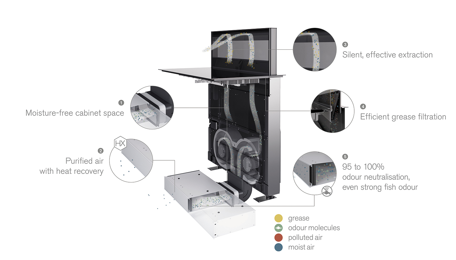 Al escoger una campana Novy con recirculación, ahorrará de manera natural en su factura de electricidad gracias a una total recuperación del calor. Novy ha optado por una solución eficaz que procesa los olores de cocción con un filtro Monoblock que elimina incluso los olores más fuertes de la cocina.